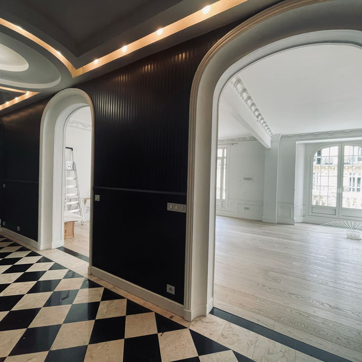Pour ce projet les clients souhaitent un appartement qui resonne avec le style haussmannien existant mais avec un cote art déco et chic soutenu.